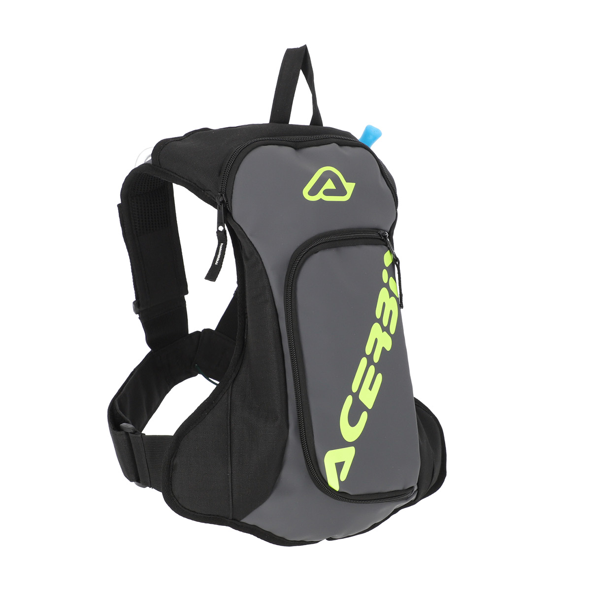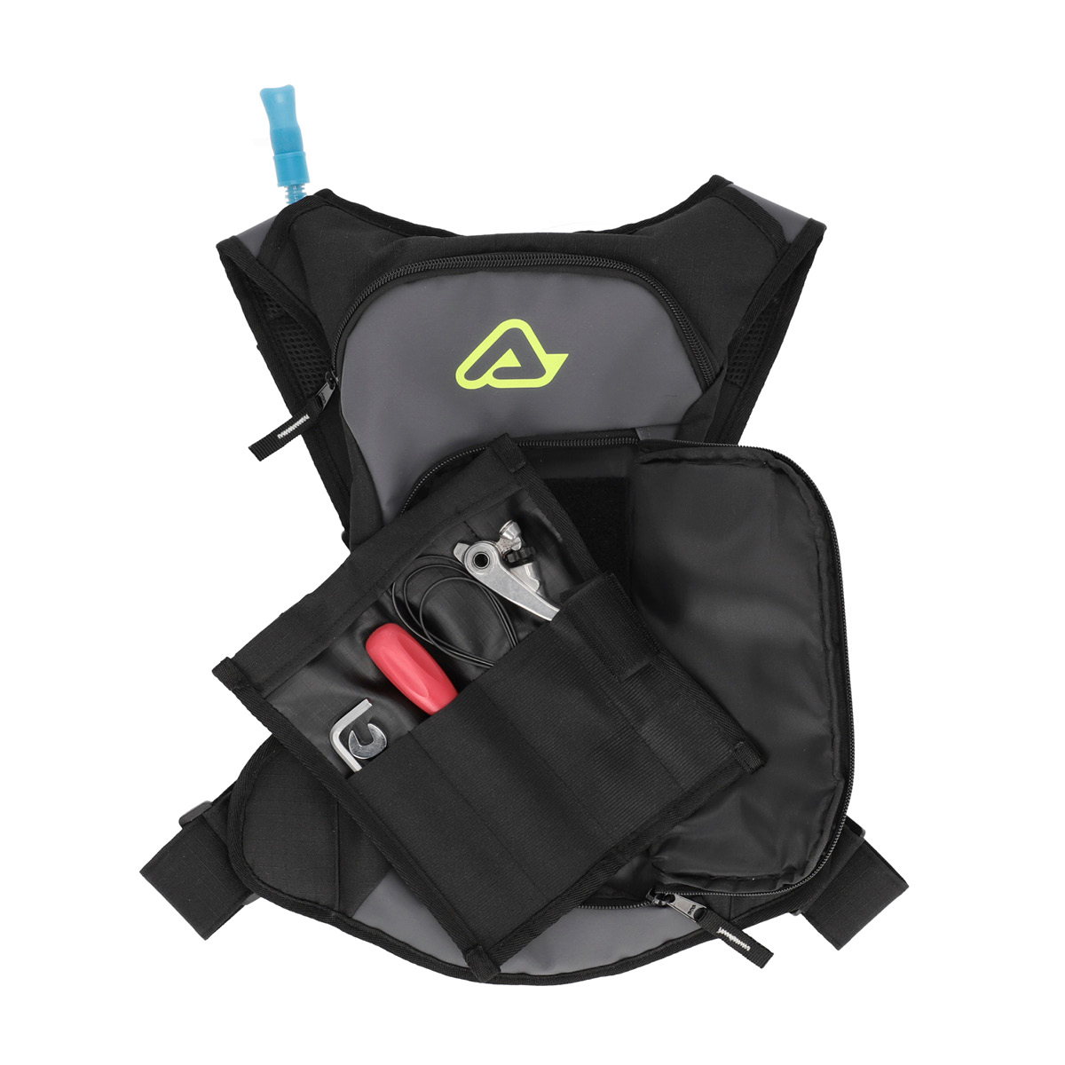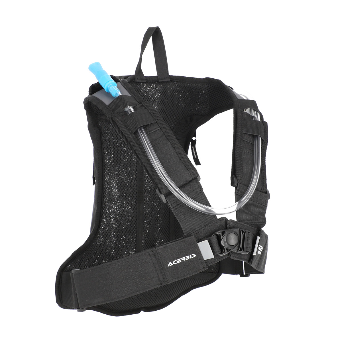 ACERBIS Trinkrucksack ACQUA ist ideal für alle, die eine Wasserversorgung benötigen und die Hüfttasche durch einen bequemen, kleinen Rucksack ersetzen möchten. Abnehmbare Werkzeugtasche mit Magnet. SBS-Reißverschluss. Das innovative „X“-Verschlusssystem mit zentralem Schnellverschluss und 4 Klettverschlüssen verhindert den Schwingeffekt und verteilt gleichzeitig den Druck der Schultergurte gleichmäßig auf die Brust und nicht auf die Schultern, wodurch eine freie und unbeschwerte Fahrt gewährleistet wird. Atmungsaktives Gewebe im Bereich, der mit dem Rücken in Kontakt kommt. Einfaches Befüllen und Reinigen dank der großen Schiebestange, die für eine wasserdichte Abdichtung einrastet.