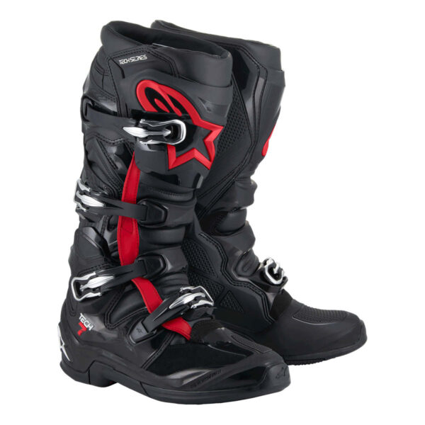 Der Tech 7 Motocross Stiefel wurde komplett überarbeitet, um ein noch besseres Fahrerlebnis zu bieten. Der Stiefel ist leichter, komfortabler und schützender als zuvor. Ein innovatives Design im Bereich des Schalthebels ermöglicht eine bessere Kontrolle, während ein Metallschaft im Zehenbereich Stoß- und Abriebfestigkeit bietet. Das Double-Pivot-System sorgt für Flexibilität und präzise Kontrolle. Durch ein Low Profile Pivot System im medialen und lateralen Knöchelbereich wird eine hohe Bewegungsfreiheit und Komfort gewährleistet. Stoßdämpfende Einsätze in der vorderen Faltenbalgzone bieten progressive Unterstützung. Die Schienbeinplatte und Knöchel sind mit stoßabsorbierender Polsterung geschützt. Die Sohle des Alpinestars Stiefels verfügt über einen Verschleißindikator, der anzeigt, wann die Sohle ausgetauscht werden muss. Die Struktur des Stiefels ist von einer Kevlar-Schicht umgeben, die die Integrität des Stiefels schützt. Der Tech 7 ist ein hochwertiger Offroad-Stiefel, der sowohl in Bezug auf Design als auch Funktionalität beeindruckt.