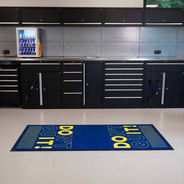 Sein stilvolles Design macht ihn nicht nur in der Werkstatt oder Garage, sondern auch im Fahrerlager zum Blickfang. Die rutschfeste Unterseite garantiert, dass die Matte sicher an ihrem Platz bleibt.