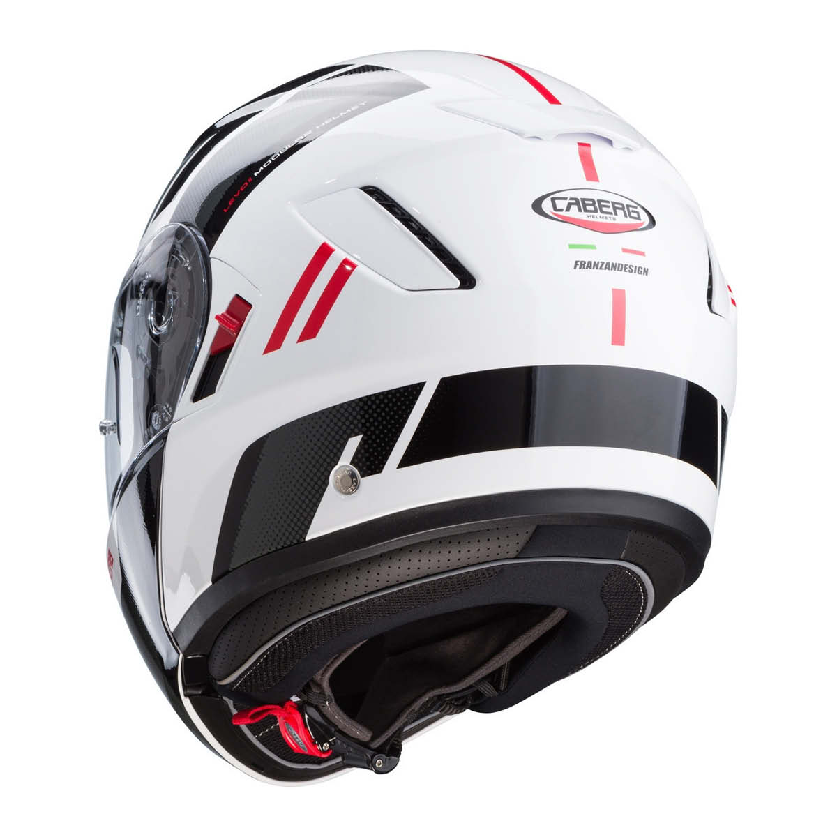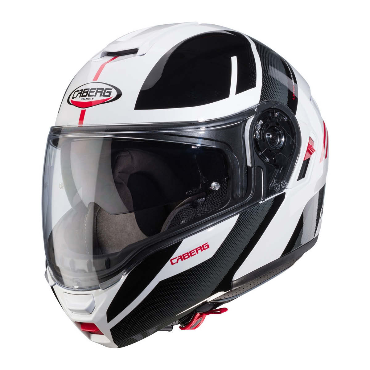 Der CABERG Klapphelm Levo X hat eine Außenschale aus TRI-Composite (Fiberglas, Carbon, Kevlar). Komfort-Innenausstattung, herausnehmbar und waschbar. Das Visier ist klar und kratzfest inklusive MaxVision Pinlocklinse und integrierte Sonnenblende. Belüftung im Kinn- und Oberkopfbereich, sowie Entlüftung am Hinterkopf. Micrometic-Ratschen-Verschluss. Helm ist für Brillenträger geeignet. Vorbereitung für ein Just Speak Evo System (nicht enthalten). Bluetooth-Sprechanlage. Doppelte Homolgation als Jet- und Integralhelm. Gewicht: 1550g +/-50g. ECE: 22.18