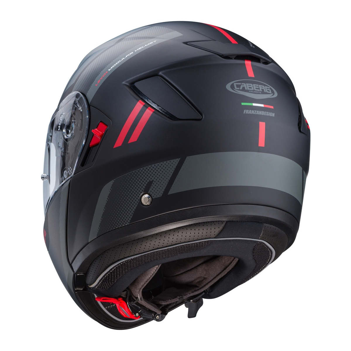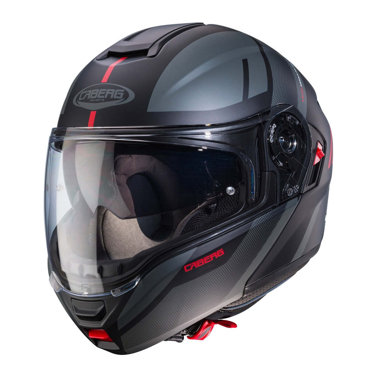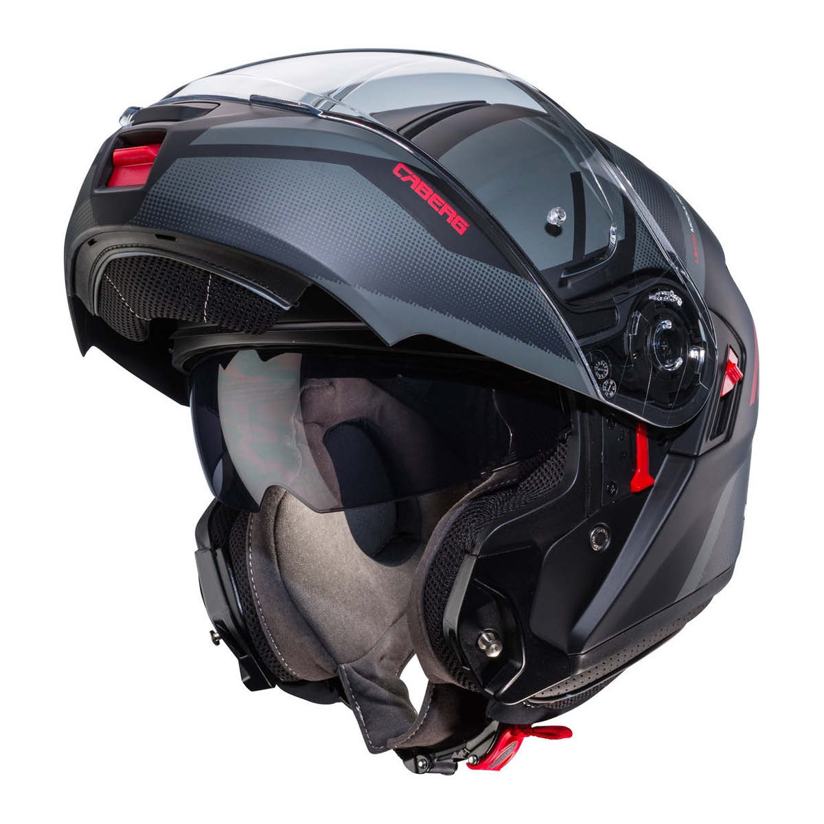 Der CABERG Klapphelm Levo X hat eine Außenschale aus TRI-Composite (Fiberglas, Carbon, Kevlar). Komfort-Innenausstattung, herausnehmbar und waschbar. Das Visier ist klar und kratzfest inklusive MaxVision Pinlocklinse und integrierte Sonnenblende. Belüftung im Kinn- und Oberkopfbereich, sowie Entlüftung am Hinterkopf. Micrometic-Ratschen-Verschluss. Helm ist für Brillenträger geeignet. Vorbereitung für ein Just Speak Evo System (nicht enthalten). Bluetooth-Sprechanlage. Doppelte Homolgation als Jet- und Integralhelm. Gewicht: 1550g +/-50g. ECE: 22.12