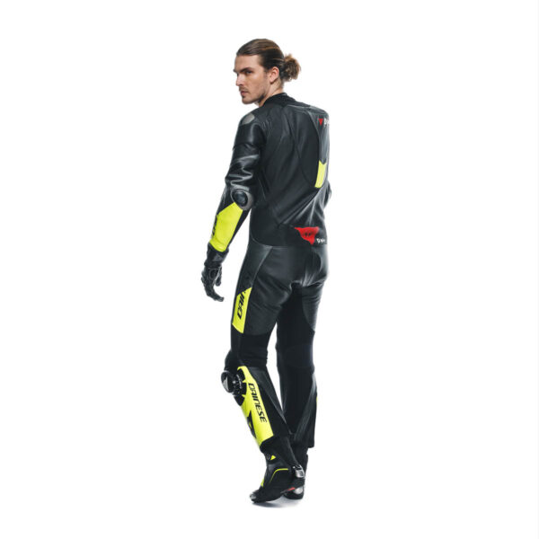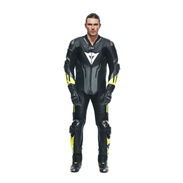 Der Motorradanzug der neuesten Generation. Der Misano 3 Perf. D-air® – aus hochwertigem vollnarbigem Rindsleder D-skin 2.0 hergestellt – wurde entwickelt, um ein Höchstmaß an Leistung und Sicherheit auf der Rennstrecke zu bieten. Maximale Performance wird durch die für den Anzug verwendeten Technologien garantiert, die ihn extrem ergonomisch und leicht machen. Das innovative elastische Pent-Axial-System am Rücken bedeutet eine Weiterentwicklung unseres Tri-Axial-Konzepts und ermöglicht mehr Bewegungsfreiheit und Mobilität in der Schräglage, da sich diese Technologie in fünf Richtungen ausdehnen und sich den Bewegungen des Motorradfahrers fließend anpassen kann. Der Misano 3 Perf. D-air® ist mit dem D-air®-System RACING SHIELD 3X mit komfortablem Racing Shield-Airbag ausgestattet. Dieser zeichnet sich durch seine patentierte Mikrofilament-Technologie aus und unterstützt bis zu 3 Aktivierungsfälle. Das System deckt den Hals-, Schlüsselbein- und Schulterbereich ab und kann erneut aufgeladen werden, indem der Gasgenerator der neuesten Generation selbstständig ausgetauscht wird. Für ein Höchstmaß an Ergonomie und Komfort verfügt der Anzug über das Veloce Racing Neck-System, das den Druck auf den Nacken reduziert und gleichzeitig die Bewegungsfreiheit erhöht, Pro-Armor-Protektoren an den Schultern und weiche Einsätze an den Hüften. Die Ärmelabschlüsse sind mit selbstblockierenden Reißverschlüssen ausgestattet, die den herkömmlichen Klettverschluss ersetzen. Zudem ermöglicht das Soft Edges Construction-System an Hals und Ärmelabschlüssen eine Anpassung an alle Armformen und -längen sowie fantastischen Komfort. Alle Abschlüsse bestehen aus weichem, abriebfestem Gewebe, das bequem und widerstandsfähig ist. Die Aluminiumplatten an Knien, Schultern und Ellbogen – eine Kultteil von Dainese – sind so konzipiert, dass sie das Rutschen im Falle eines Unfalls unterstützen. Dank des Replaceable Slider System (RSS) ist es möglich, den Knieslider zu wechseln, ohne die Position der am Klettverschluss des Anzugs befestigten Basis zu ändern. Die Ellbogenslider lassen sich je nach Präferenz und erreichtem Neigungswinkel leicht in zwei vordefinierte Positionen einstellen. Sicherheit wird mit thermischem Komfort kombiniert, garantiert durch das perforierte Gewebe an beiden Seiten des Anzugs und durch größere Belüftungsbereiche an wichtigen Stellen. Das In- und Out-Boot-System ermöglicht es, die Stiefel sowohl unter als auch über dem Anzug zu tragen und so Fuß und Knöchel zu schützen. Das Waterbag-Kit und das neue herausnehmbare und waschbare Innenfutter runden die Ausstattung dieses revolutionären Motorradanzugs ab.