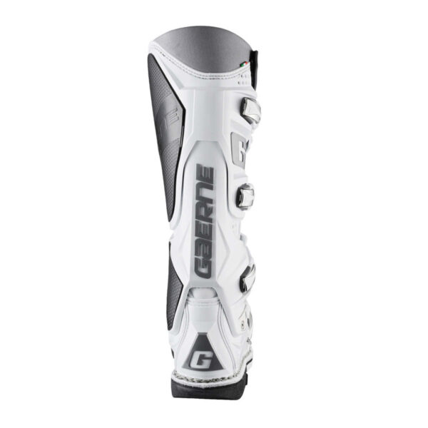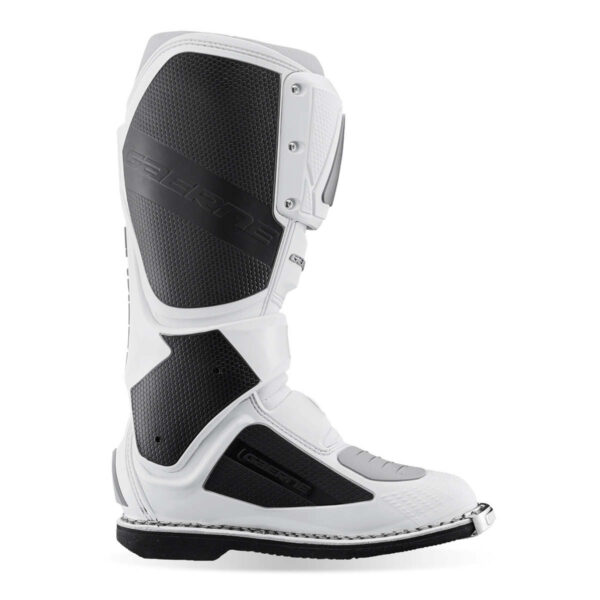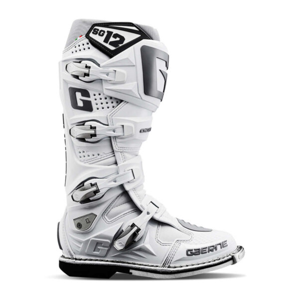 Der Gaerne SG12 ist der Ultimative Motocross Stiefel. Um eine Überdehnung oder Überkompression zu verhindern bietet das DSPS (Dual Stage Pivot System) einen sehr guten seitlichen Halt. Die Schienbeinplatte ist aus PU gespritzt, während die Fersenkappe für einen besseren Schutz und höheren Komfort sorgt. Der Zehenbereich wurde so geformt, dass man stets ein gutes Gefühl beim Schalten hat. Für einen optimalen Halt sorgen die vier leichten und austauschbaren Verschlussschnallen. Der Klettverschluss am oberen Bund des Stiefels sorgt für eine sichere Passform. Die hitzebeständige Polsterung an der Innenseite trägt ebenso zu einem guten Halt bei. Der vordere Teil des SG12 ist für eine gute Belüftung ausgelegt, was die Luftzirkulation im Inneren fördert. Die robuste Gaerne Goodyear Welted Sohle sorgt für eine langlebige Sohlenkonstruktur. Der SG12-Stiefel ist CE-zertifiziert gemäß EN 13634:2017 und der Verordnung EU 2016/425.