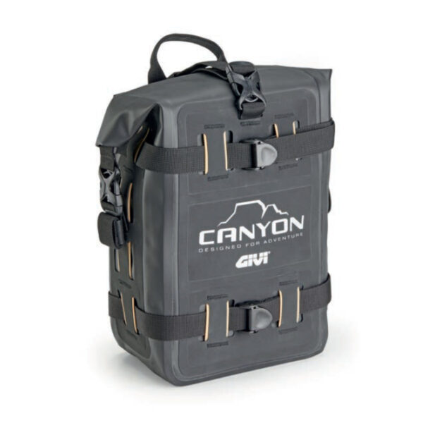 GIVI CANYON Pack- und Motortasche hergestellt aus hochfestem TPU 840D, doppelt beschichtet, wasser- und reißfest und rutschhemmenden PVC. Aufgedruckte reflektierende Motive erhöhen die Sichtbarkeit. Die Tasche wird am Motorschutz mit verstellbaren Riemen mit Klemmverschluss befestigt.