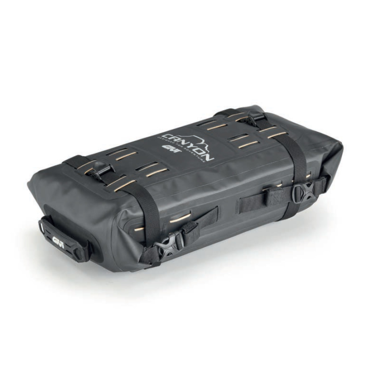 GIVI CANYON Packtasche hergestellt aus hochfestem TPU 840D, doppelt beschichtet, wasser- und reißfest und rutschhemmenden PVC. Aufgedruckte reflektierende Motive erhöhen die Sichtbarkeit. 2 Befestigungsgurte mit Duraflex®-Nockenschnalle, um die Spannung zu halten und die Tasche schnell am Motorrad zu befestigen/lösen zu können. Ergonomische Handgriffe für den Transport.