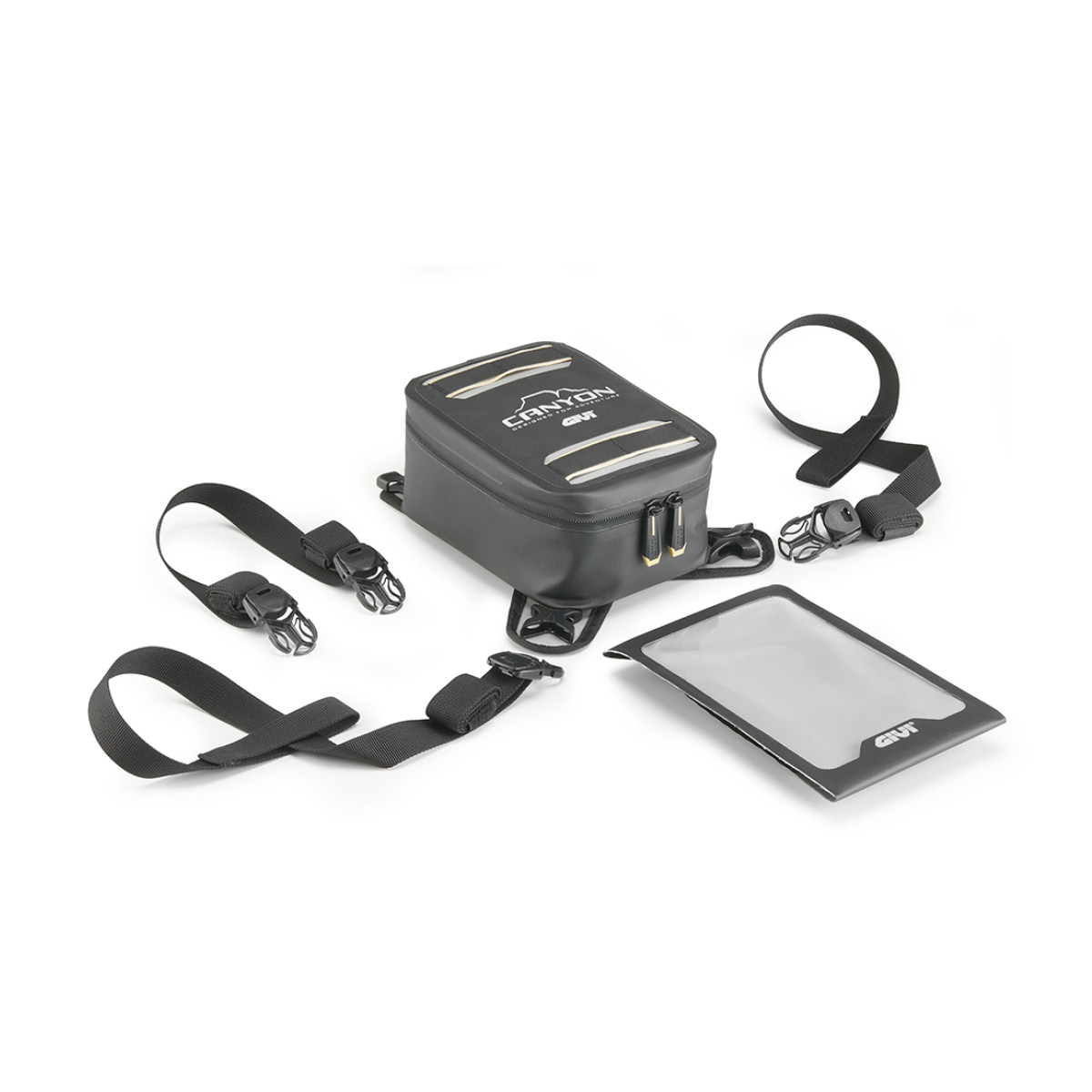 Der GIVI GRAVEL-T Tankrucksack ist ein wasserdichter Tankrucksack, mit Riemen und Nockenschnallen. Hergestellt aus hochfestem TPU 840D, doppelt beschichtet, wasser- und reißfest. Mit herausnehmbaren EVA-Futter, rutschhemmenden PVC an der Basis für erhöhte Stabilität und einem Außenmaterial mit hoher UV-Beständigkeit. Der Tankrucksack hat eine abnehmbare, wasserdichte Smartphone-Halterung, die oben auf den Deckel geklippt wird und reflektierende Elemente für bessere Sichtbarkeit.