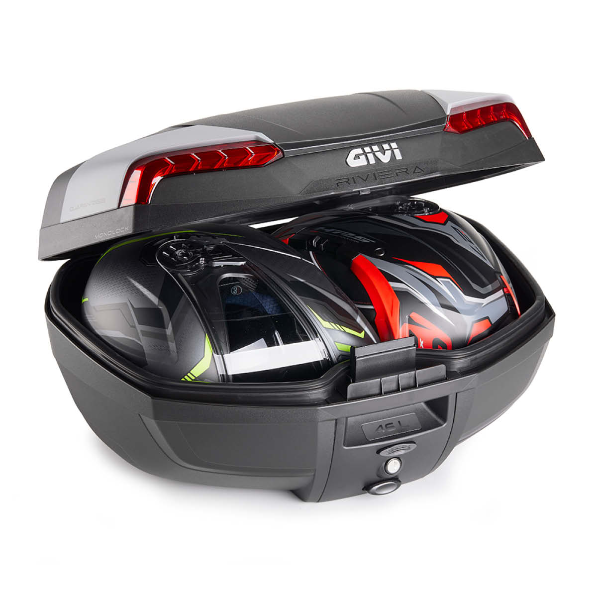 Das GIVI RIVIERA Topcase Monolock, ist das neue Topmodell unter den Topcases mit Monolock Befestigung. Es ist serienmäßig mit einer weichen, herausnehmbaren Matte ausgestattet, die mit einem Klettband am Boden befestigt wird. Es kann zwei Integralhelme aufnehmen. Der Innenraum hat Platz für die weiche Innentasche GIVI T502B (die als optionales Zubehör erhältlich ist). Das Schloss ist kompatibel mit dem Security Lock Sicherheitsschloss SL101 (optionales Zubehör). Es besticht mit einer hervorragenden Wasserdichtigkeit. Lieferung inkl. Universalplatte und Montagekit.