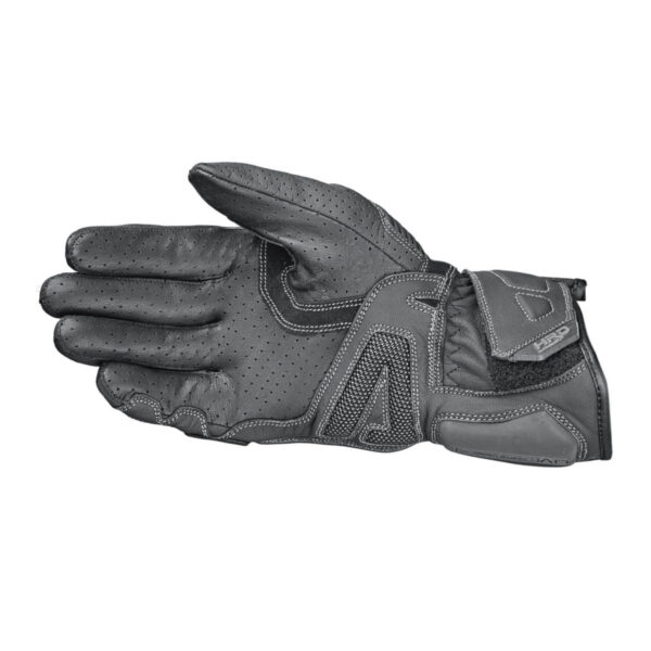 Die Hartplastik-Seitenschale ist mit einem Lederbezug versehen. Der Handballen und die Fingerknöchel sind mit SuperFabric® Material verstärkt. Die perforierten Fingerschichten gewährleisten eine optimale Belüftung bei warmen Temperaturen. Der Klettverschluss an der Stulpe sorgt für optimalen Sitz und Komfort.