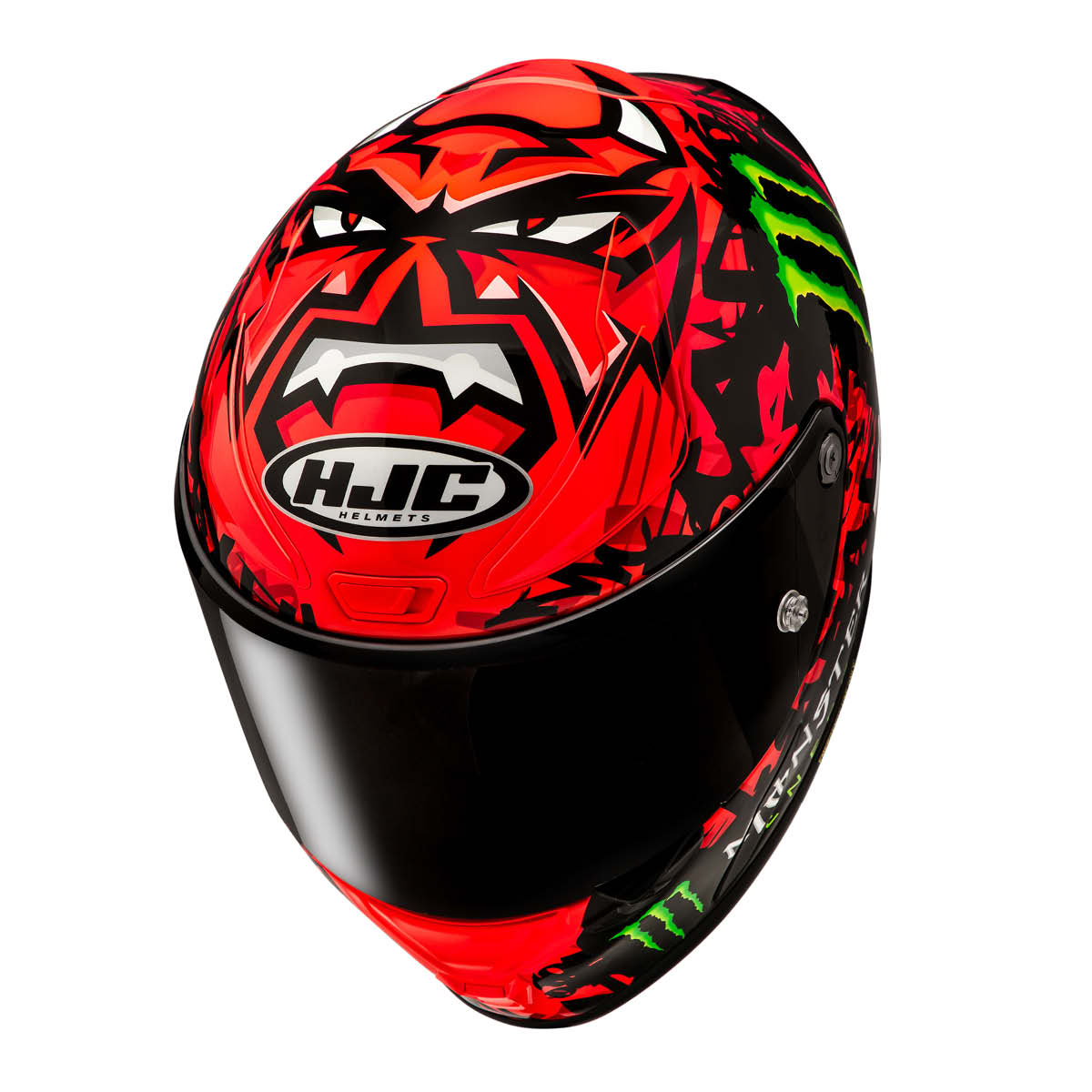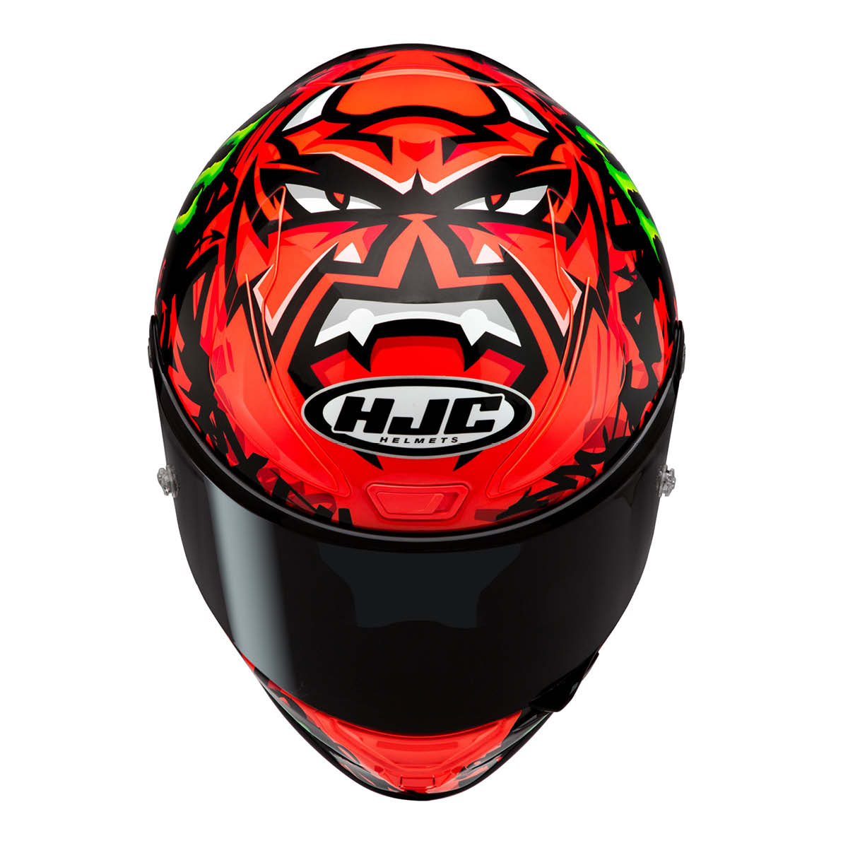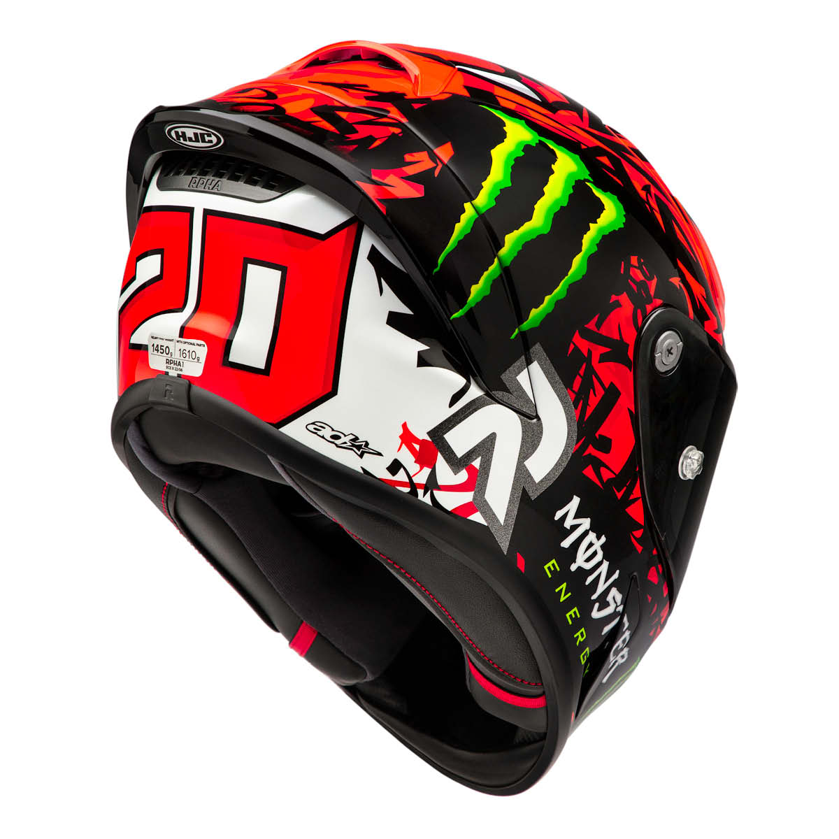 Der HJC RPHA1 ist ein aus Carbon und Carbon-Glas-Hybrid-Gewebe bestehender Integralhelm. Das aerodynamische Schalendesign sorgt für eine gute Rennperformance. Für eine gute Luftzirkulation sorgen die 5 Lufteinlässe und die 4 Luftauslässe. So kann die Wärme nach oben oder außen abgeleitet werden. Um ein sicheres Verriegeln des Visiers auch während des Renneinsatzes zu gewährend, ist der RPHA1 mit einem Visier-Doppelverschluss-System ausgestattet. Das EASY-Befestigungssystem ermöglicht einen einfachen Visierwechsel ganz ohne Werkzeug. Kopf- und Wangenpolster sind herausnehmbar und waschbar. Der Doppel-D Verschluss hält den Helm sicher geschlossen und in seiner Position. Serienmäßig ist der Helm mit einem klaren Visier ausgestattet. Durch das Emergency Kit (Wangenpolster) hilft in einer Notfallsituation für eine rasche und schnelle Versorgung. Der Helm ist ECE22.06 zertifiziert und auch FIM Racing homologiert.