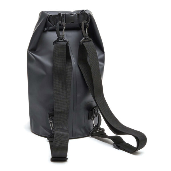 Abnehmbare und verstellbare Schultergurte mit Clip-System für einfaches Tragen. Roll-Top mit Schnallenverschluss. Vordere Außentasche mit wasserdichtem Reißverschluss.