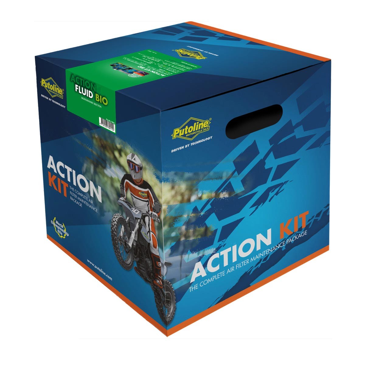 PUTOLINE Action Kit Biodegradable ist ein Reinigungs-Set für den Luftfilter. Set bestehend aus 1 großen Kübel inkl. Deckel und Gitter zur Filterreinigung, 1 kleinen Kübel inkl. Deckel zur Filterimprägnierung, Filterreiniger Action Cleaner Bio (600g), Luftfilteröl Action Fluid Bio (1 Liter), 10 g Silicone Compound, 1 Paar Einweghandschuhe, 1 Spezialaufkleber Action Fluid.