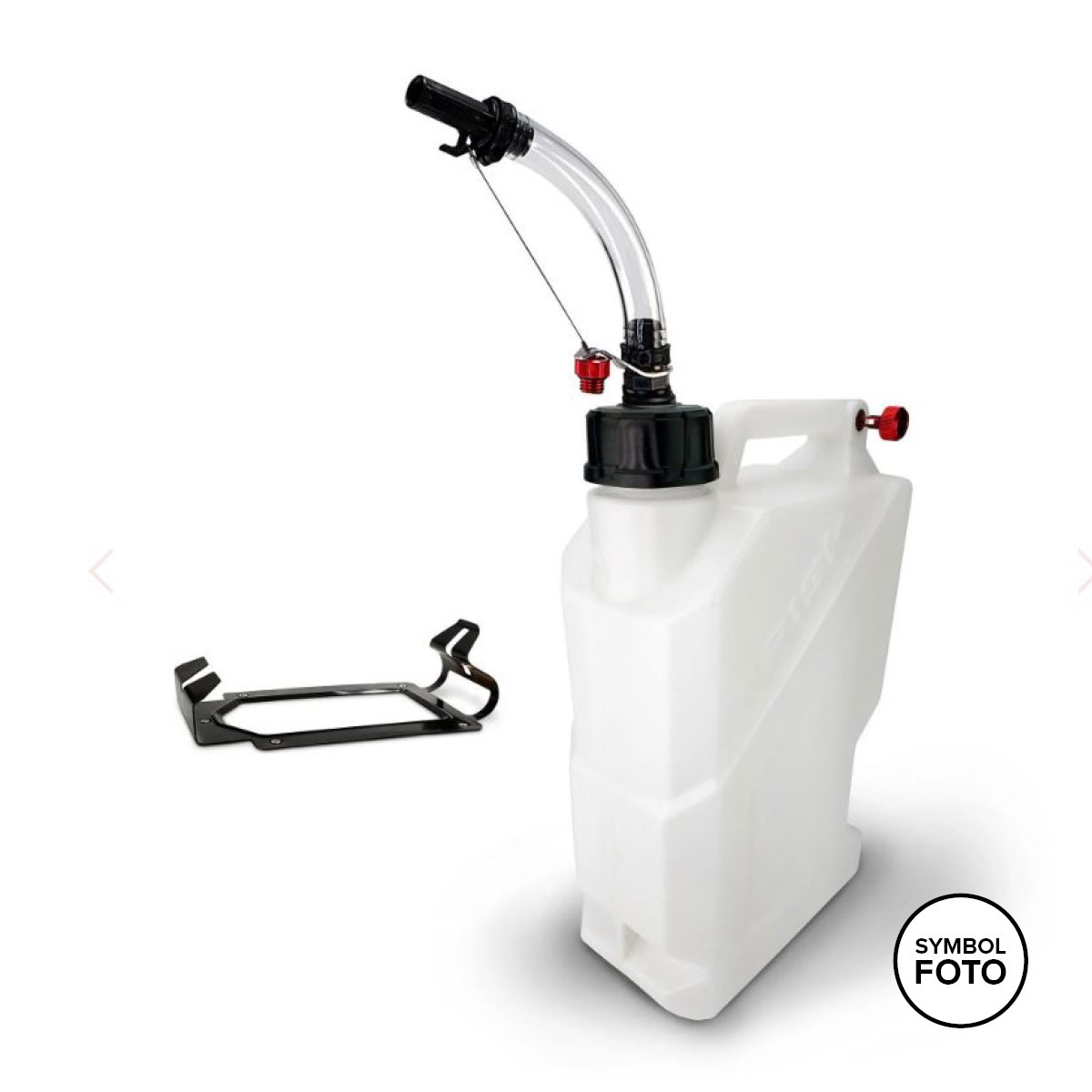 Praktisches Combo Set, 10L Benzinkanister, Schlauch und Standmontage von RISK RACING aus dickwandigem Polyethylen für sauberes Tanken, vielseitige Griffmöglichkeiten, 3/4 Zoll Innengewinde.