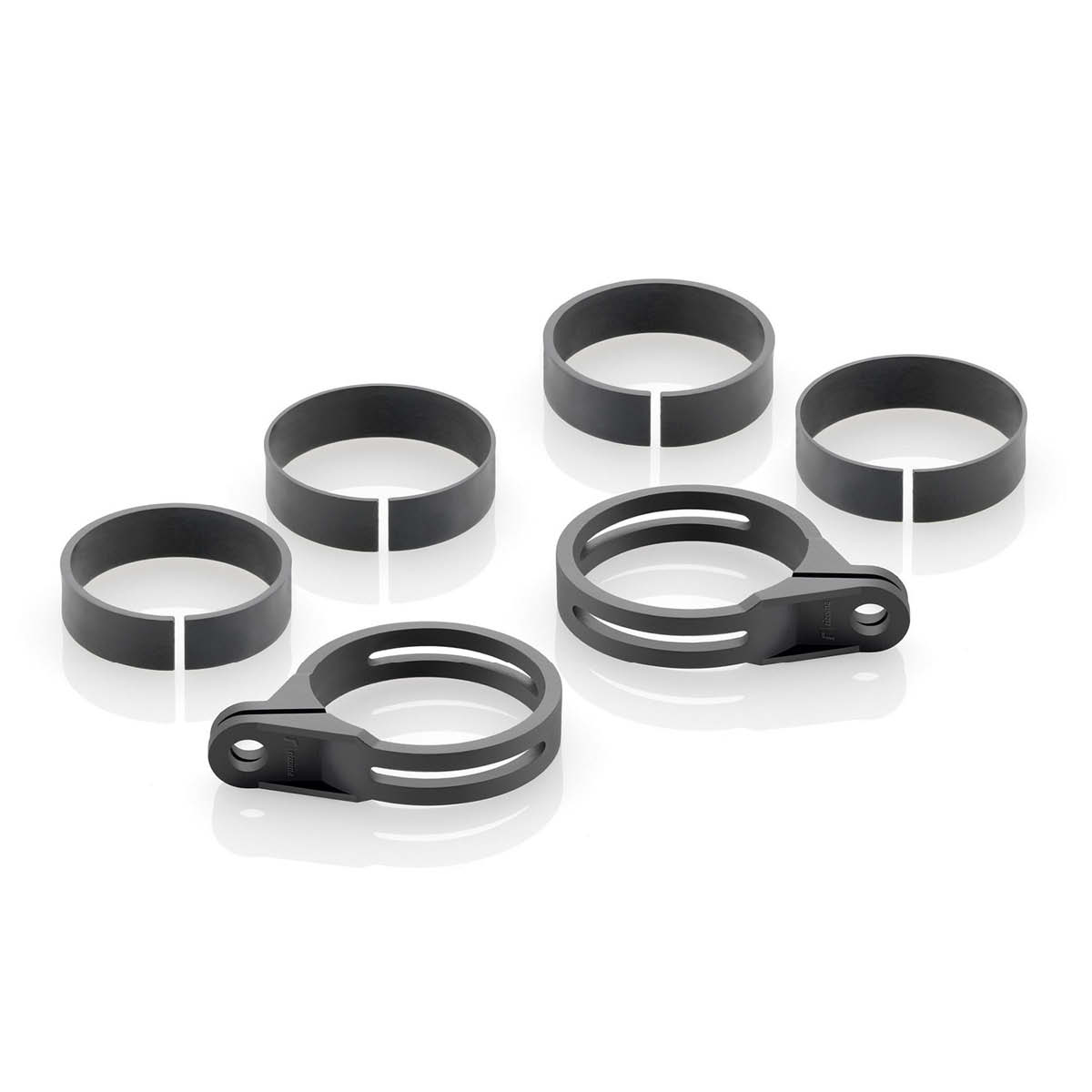 Dieses KIT wird aus der sehr dehnbarem Kunstfaser Technopolymer hergestellt, dadurch ist das Entfernen der oberen Gabelbrücke für die Montage nicht erforderlich. Um die Blinker auf verschieden Modelle montieren zu können, beinhaltet das KIT 3 Klemmschellen für die unterschiedlichen Gabeldurchmesser (50/52mm und 48-55mm).