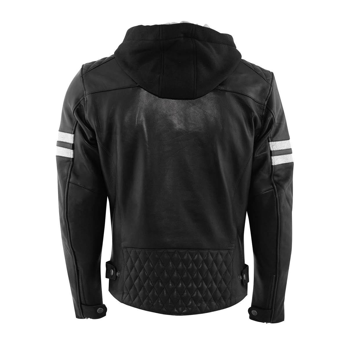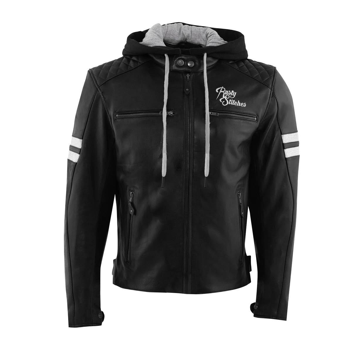 Die Lederjacke von Rusty Stitches zeichnet sich durch Komfort und Stil aus. Die Neuerungen beinhalten ein verbessertes Innenfutter, Rückenbelüftung und einen Knopf auf der Rückseite, um den Hoodie zu befestigen. Die Jacke besteht aus hochwertigem Rindsleder und bietet zwei Belüftungsreißverschlüsse auf der Brust und herausnehmbare, flexible Protektoren an Schulter und Ellbogen für Sicherheit. Ein Rückenprotektor kann optional nachgerüstet werden. Die Jacke ist CE-geprüft AA und verfügt über ein herausnehmbares Thermofutter, Schnapp-Krallen, eine verstellbare Taille und Handgelenk, sechs Taschen sowie eine abnehmbare Kapuze. Das Äußere der Jacke besteht aus 100% Rindsleder, das feste Innenfutter aus 100% Polyester und das herausnehmbare Futter ebenfalls aus 100% Polyester.