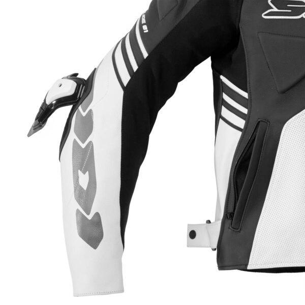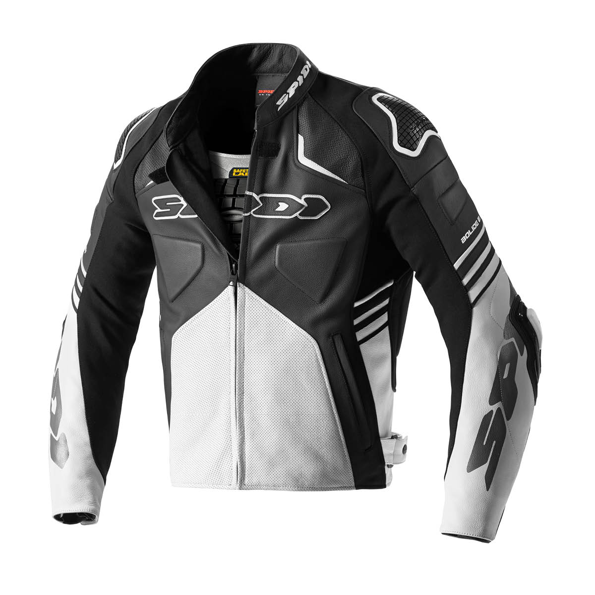 Für zusätzlichen Schutz gibt es eine interne Anordnung für entweder ein Level 1 oder 2 Warrior Rückenprotektor, und ein Warrior Brustprotektor, beide separat erhältlich. Das Hauptmaterial des SPIDI Bolide Perforiert ist 1,1 bis 1,2 mm dickes Rindsleder mit hochfesten, elastischen Flex Tenax Nylon 6.6-Flexabschnitten.