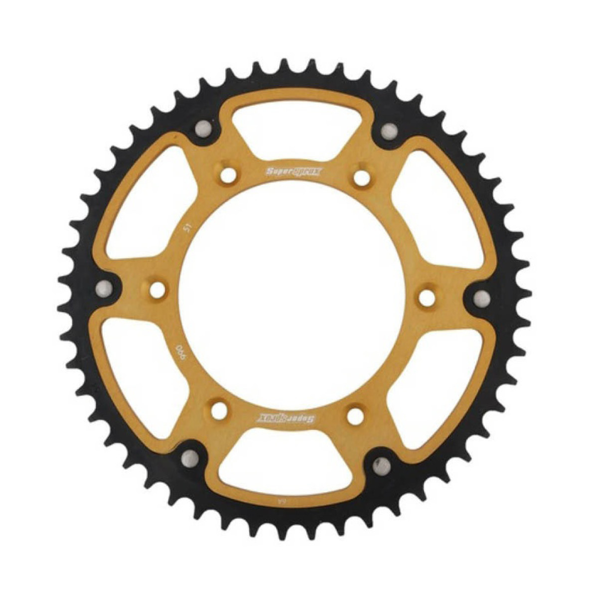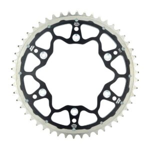 Die hochwertigen Zahnkränze von SUPERSPROX besteht aus zwei Materialien. Die Stahlzähne halten bis zu dreimal länger als Aluminium, der Kern besteht aus CNC-gefrästen eloxiertem Aluminium und ist daher leichter als Stahl.