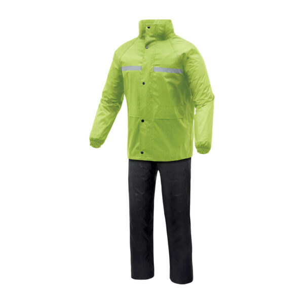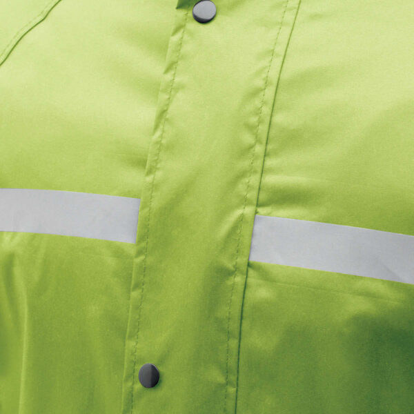 Das Produkt ist ein Set bestehend aus einer wasserdichten Jacke und Hose. Die Konstruktion besteht aus einem wind- und wasserdichten Polyester-Obermaterial mit hoher Wassersäule. Die Nähte sind verschweißt, einschließlich am Kragen. Die Sicherheit wird durch reflektierende Einsätze auf Brust und Rücken erhöht. Der Komfort wird durch Knöchelverstellungen mit Knöpfen, zwei Außentaschen an der Jacke und eine Reißverschlusstasche zur Aufbewahrung des Regensets gewährleistet. Die Wasserdichtigkeit des Sets beträgt 5.000 mm.
