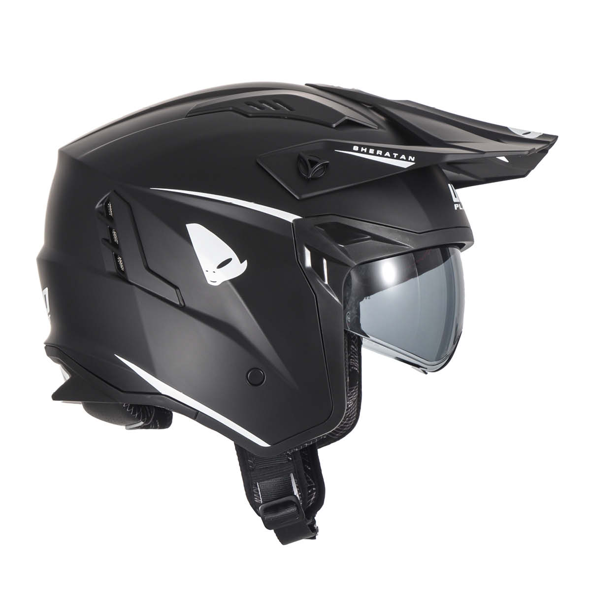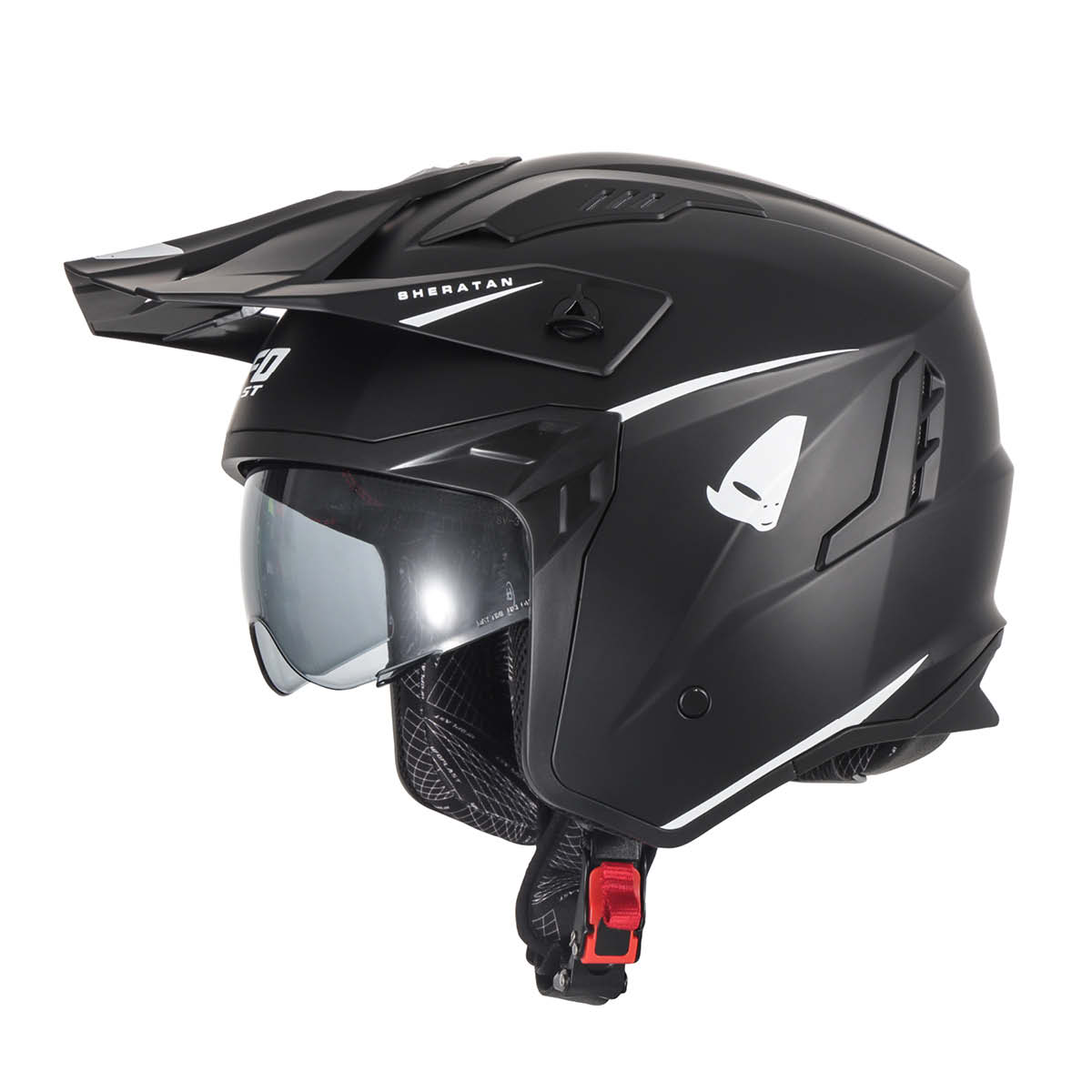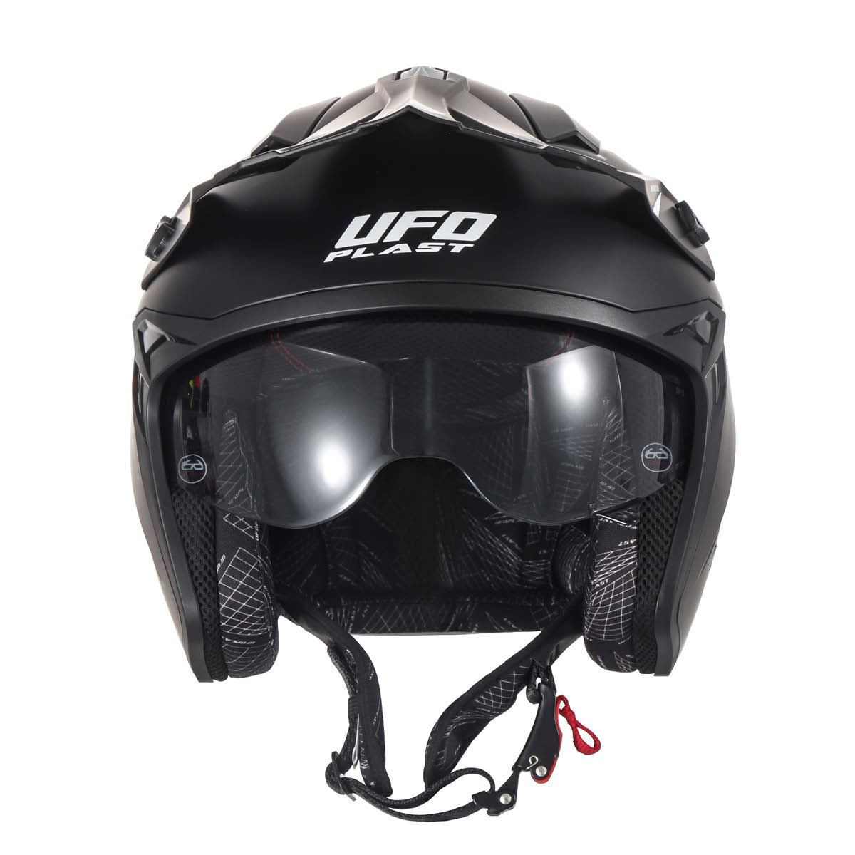 Der UFO Jethelm Sheratan ist designt um komfortabel und sicher um im urbanen Bereich unterwegs zu sein. Der Helm verfügt über eine Thermoplastic Schale mit hoher Festigkeit und kompakter Dimensionen, sowie veredelter Oberflächen. Vorbereitung für Intercom System. Der Helm hat ein UV-Sonnenvisier und ein effizientes Belüftungssystem. Das Innenfutter ist aus hypoallergenem Material und ist herausnehmbar und waschbar. Micrometric-Verschluss und Quick-Release. Gewicht: 1150 ± 50gr.(Größe M). ECE 22.06.