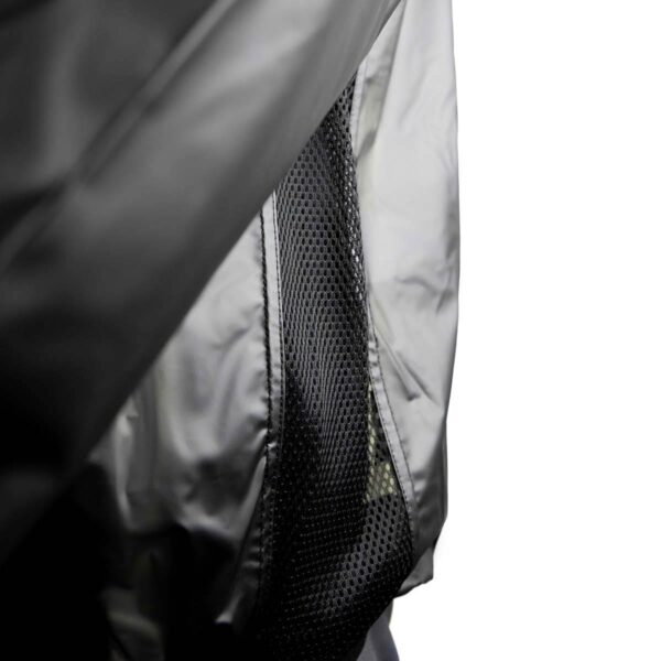 Die leichte Regenjacke besteht aus einem weichen, transparenten Material, das zwar leicht, aber dennoch robust ist und zuverlässig vor Nässe, Schlamm und Wind schützt. Großzügige Mesh-Belüftungszonen an den Seiten sorgen dafür, dass überschüssige Wärme entweichen kann, so bleibt das Körperklima auch bei Anstrengung angenehm.