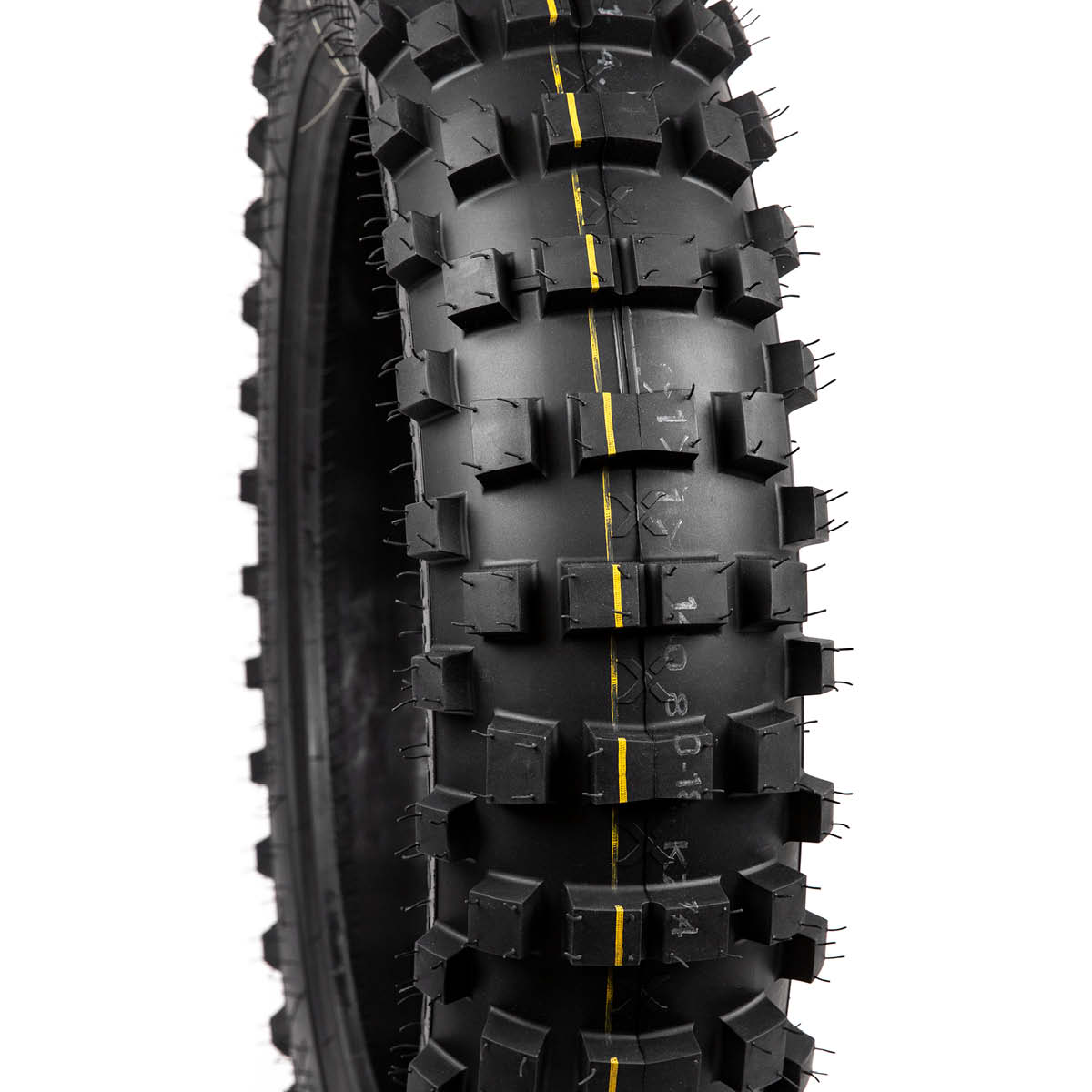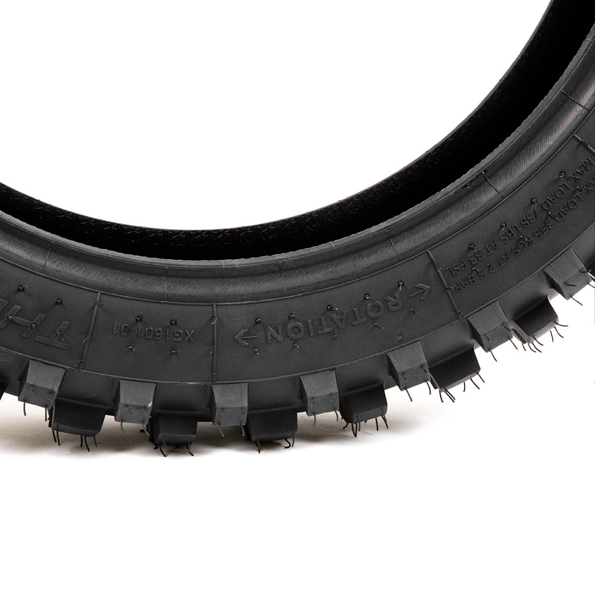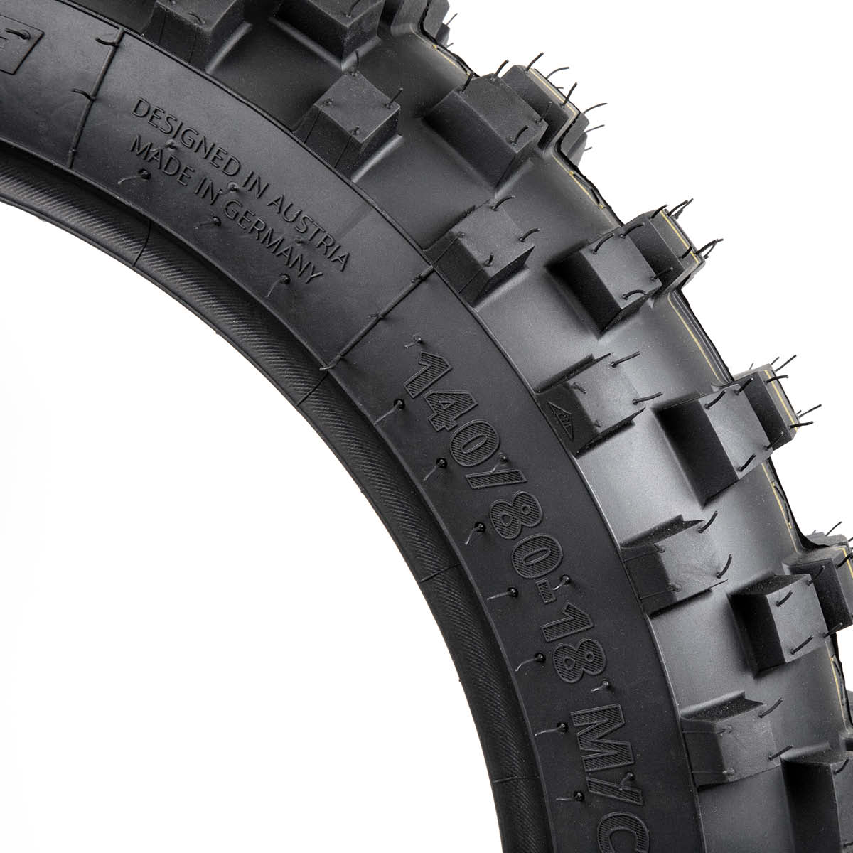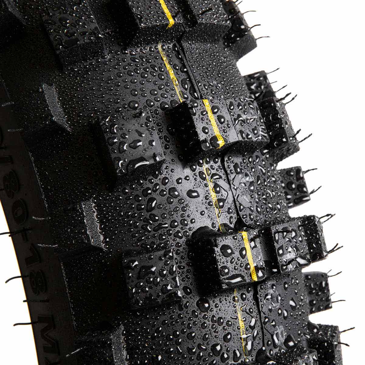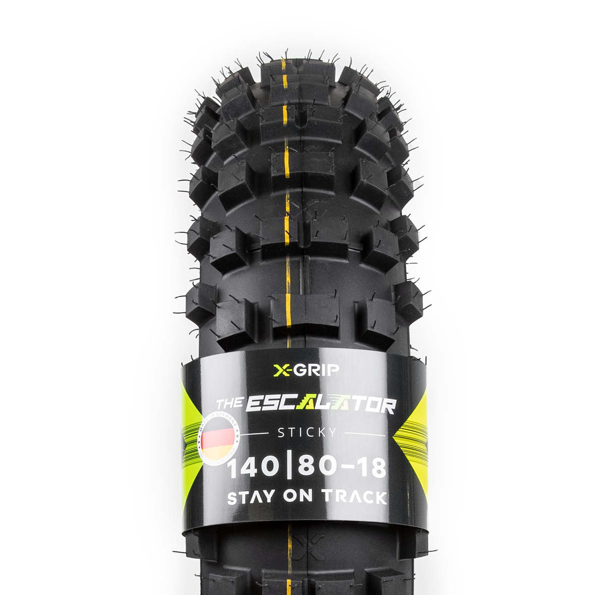 Der X-GRIP Reifen „THE ESCALATOR“ ist ein Hardenduro-Reifen, welcher für die extremsten Bedingungen entwickelt wurde. Durch die stark silica-haltige Mischung, genannt „STICKY“, weist er ein irrsinnig plastisches, klebriges Verhalten auf und liefert so den maximalen Grip. Diese „no-bounce-back“ Eigenschaft machen ihn zum GAMECHANGER unter den Extremenduro-Reifen. Als Einziger in dieser Kategorie ist er standardmäßig mit einer E-Nummer (und DOT Nummer) – somit straßenzugelassen – ausgestattet. Gefertigt in Deutschland wurde er speziell für 1-Tages-Veranstaltungen unter den härtesten Bedingungen konzipiert und soll so die maximale Performance liefern.
