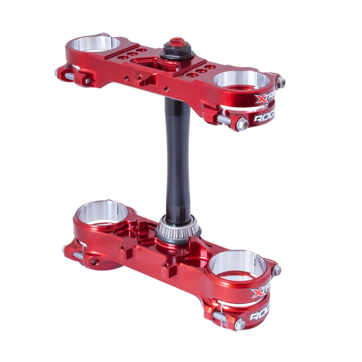 Das neue System XTRIG ROCS PRO bietet eine noch höhere Stabilität der Gabelbrücken. Zu den Vorteilen zählen ein besseres Ansprechverhalten der Gabel, perfekte Rundung im Klemmbereich auch unter Belastung, höhere Verdrehsicherheit der Gabel und Selbsthemmung der Gabelrohre in beide Richtungen. Die geteilten Klemmschellen bewirken eine optimale Funktion der Gabel. Durch die sichere Klemmung der Gabel gibt es keine gegenseitiges Beeinflussen der Klemmschrauben-Vorspannung. Das geringere Gesamtgewicht ergibt sich dadurch, dass kein Material zwischen den Klemmschrauben verarbeitet wurde. Lenkeraufnahmen M12 (PHDS, FIX-System oder FLEXFIX) bitte gesondert bestellen.